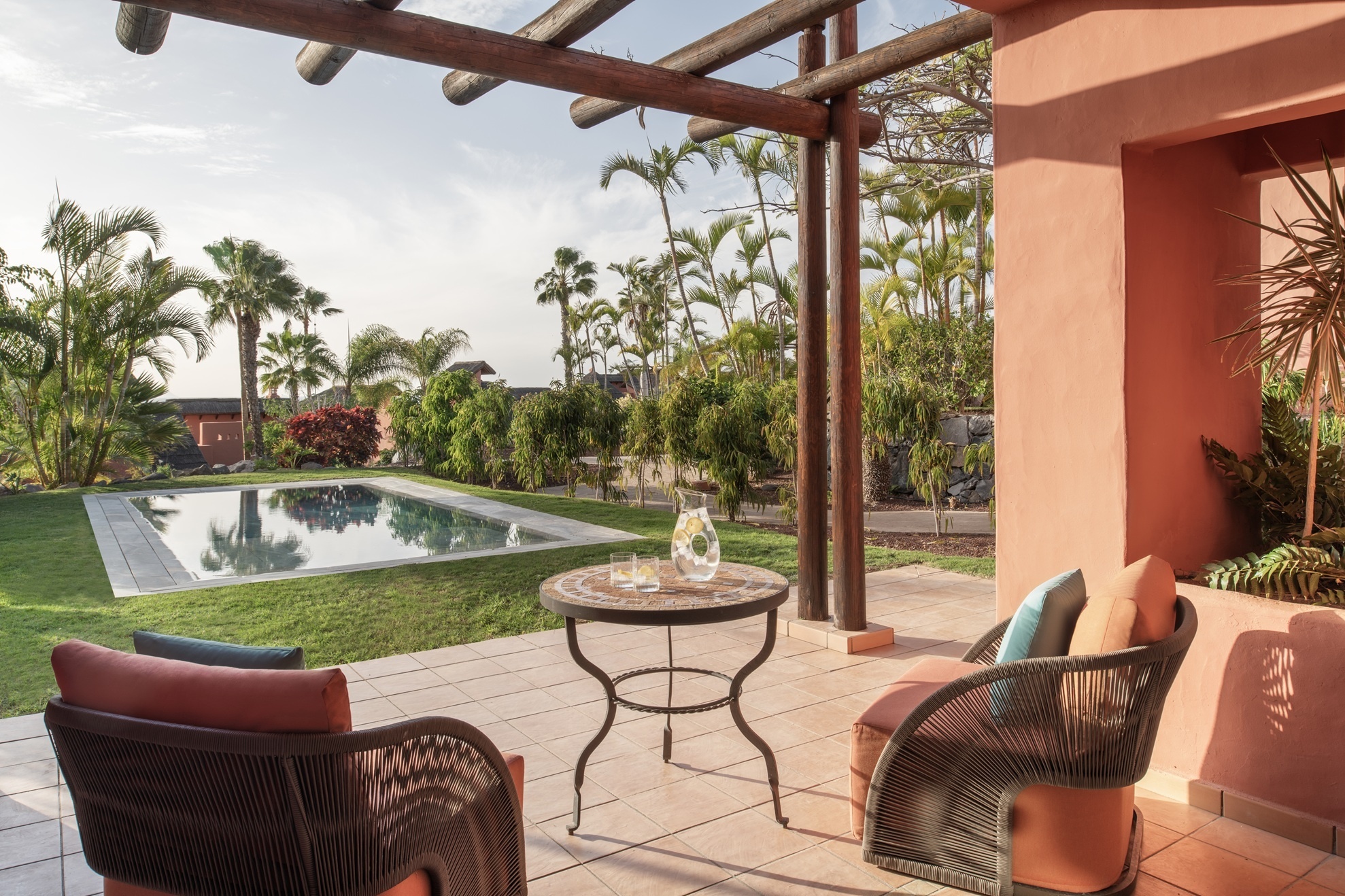 Eine Sehenswürdigkeit für sich ist allein schon das Hotel selbst – eingebettet in eine weiträumige Anlage direkt am Meer, die sich terrassenförmig an die Hänge des Vulkans Teide schmiegt. Umgeben von Bananenplantagen und einer subtropischen Landschaft genießt man feinstes Luxus-Lebensgefühl.